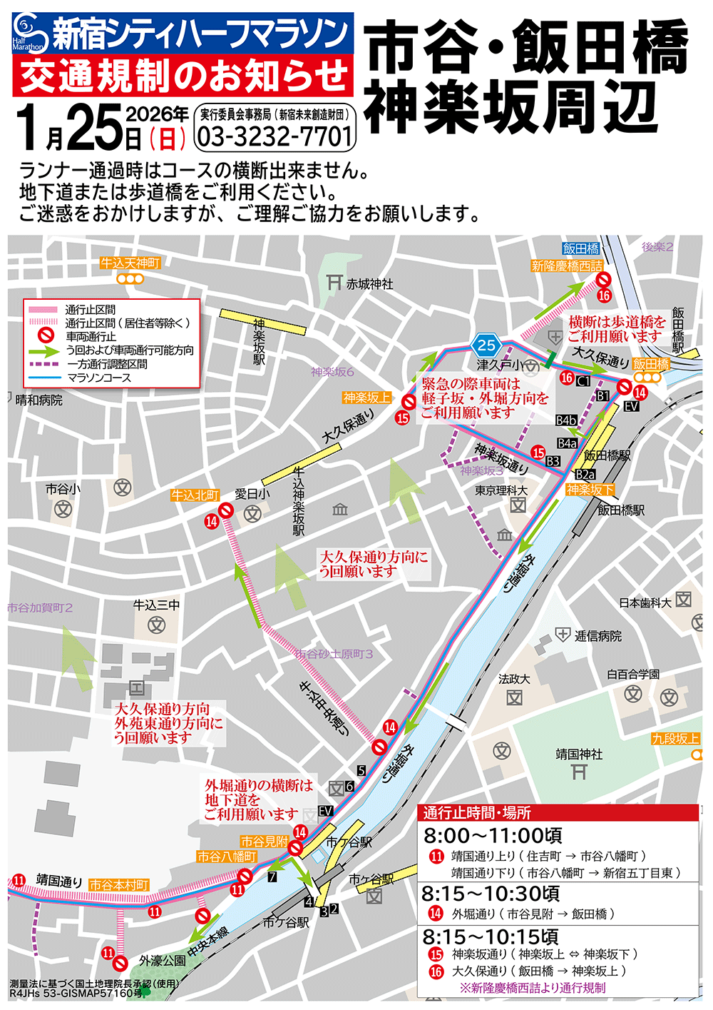 En raison du semi-marathon de Shinjuku, des restrictions de circulation et des perturbations locales sont prévues dans l’arrondissement de Shinjuku le dimanche 25 janvier 2026 entre 8h15 et 10h30.